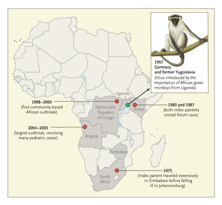 - A la República Democràtica del Congo, entre 1998-2000, en Durba, al nord-est del país, es donaren brots successius, de soques no idèntiques, amb cadenes de transmissió curtes (uns pocs infectats cada cop). Afectaven a treballadors de la mina Goroumbwa, on els ratpenats abundaven. La mortalitat fou del 83%. Els miners que baixaven a la mina (sota terra, dins la cova) constituïen quasi tots els afectats; el miners de les set mines obertes, al aire lliure no patiren genèricament la malaltia. El brot epidèmic cessà quan la mina s’inundà amb unes pluges intenses.