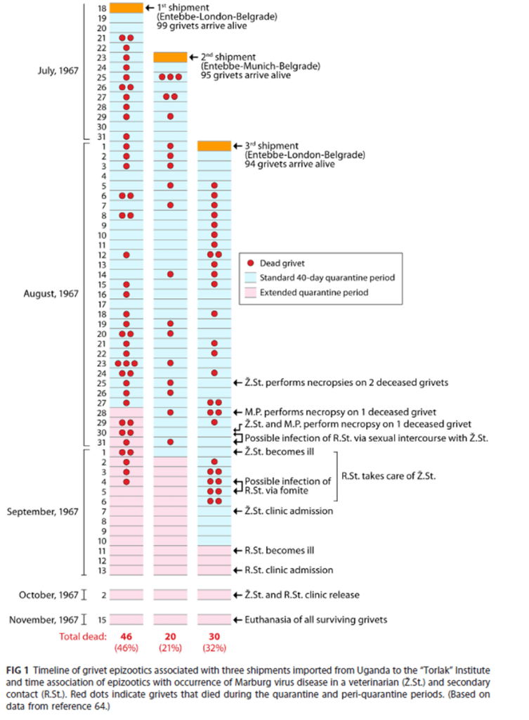 En les dues darreres setmanes de juliol del 1967, l’institut Torlak rebé tres lots de 100 micos (Chlorocebus aethiops) cadascun. Dos enviaments arribaren via Londres, l’altra per Munich. 12 animals (dels tres lots) moriren durant el transport. La resta, 288, foren deixats en quarantena, un cop arribats, per 40 dies, cada lot en una sala independent. Durant aquesta quarantena, un NOMBRE INUSUALMENT GRAN de micos anaren morint, 46/99 (46%) del primer lot; 20/95 (21%) del segon; 30/94 (32%) del tercer (podeu veure la seqüència en la present imatge). Es van necròpsiar alguns dels animals morts (2, procedents del 3er enviament, via Londres), el 25 d’agost, i va ser el veterinari que va fer les necròpsies qui es va infectar dies després (també a la imatge). Aquell dia va haver un petit incident que es va reportar, i el dia 30 la mateixa persona va fer mes necròpsies amb un segon col·lega.